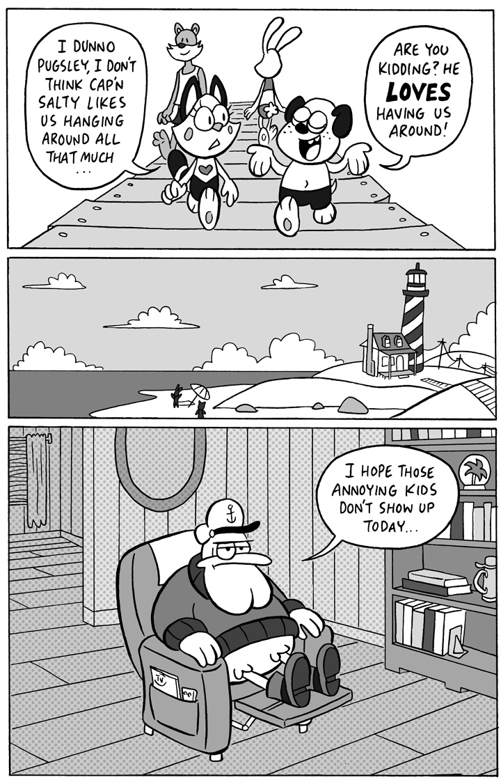 Pugsley and Callie love to visit local curmudgeon Captain Salty... too bad he doesn't enjoy having their company. Can he find a way to get them out of his feathers so he can watch television?